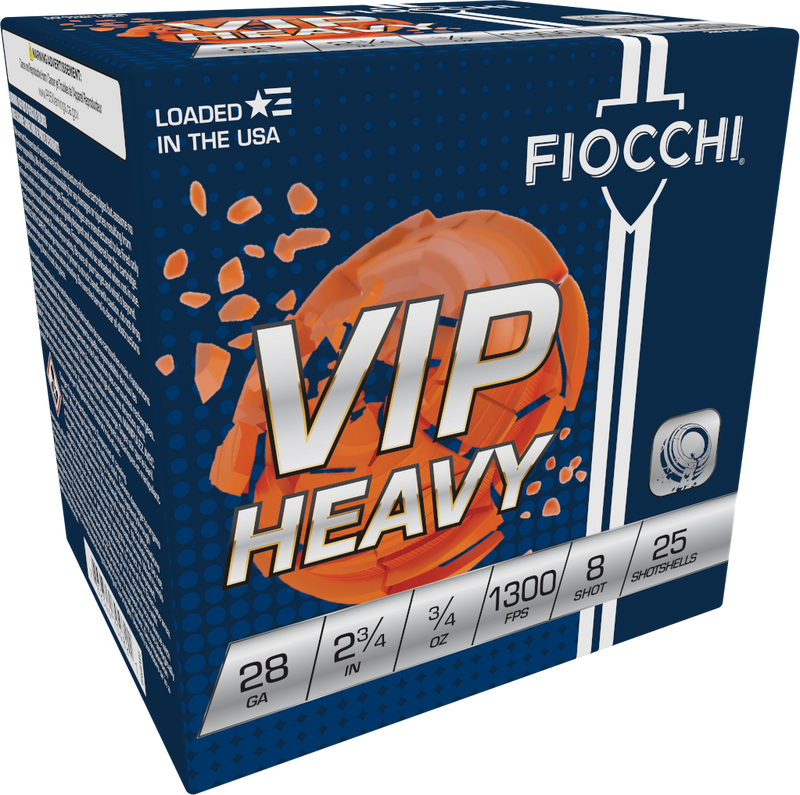Fiocchi Exacta Target VIP Heavy shotshells in 28 gauge, 2-3/4" shells loaded with 3/4 oz of #8 lead shot at 1300 fps. These low brass plastic-cased rounds are designed for target shooting and sport shooting applications. Pack contains 25 rounds per box, with 10 boxes per case.