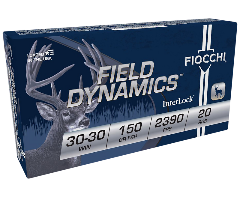 Fiocchi Field Dynamics 30-30 Winchester centerfire rifle ammunition featuring 150 grain Hornady InterLock flat soft point bullets with a muzzle velocity of 2390 fps and 1902 ft-lbs of energy. Loaded with high-quality components in brass cases with boxer primers, this ammunition cycles reliably through lever-action rifles and is suitable for range practice or whitetail hunting.