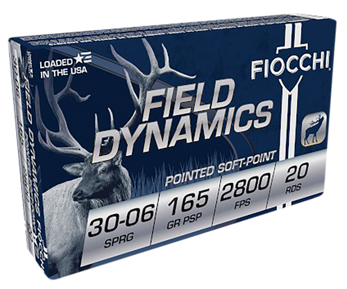 Fiocchi Field Dynamics .308 Winchester centerfire rifle ammunition with 165 grain pointed soft point bullets, loaded to 2700 fps with 2872 ft-lbs of muzzle energy. Brass cased, reloadable ammunition designed for hunting and target shooting with repeatable accuracy and reliable terminal performance.