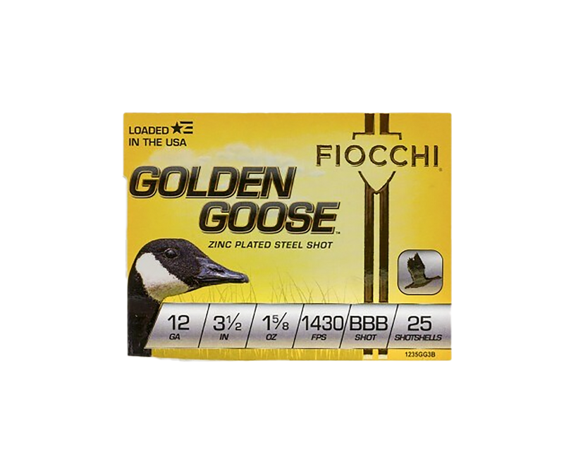 Fiocchi Golden Goose waterfowl shotshells in 12 gauge with 3.5" plastic cases loaded with 1 5/8oz of zinc-plated steel BBB shot at 1430 fps. These loads are designed for waterfowl hunting, delivering dense patterns and consistent performance with heavy-duty wads and no-fail primers.