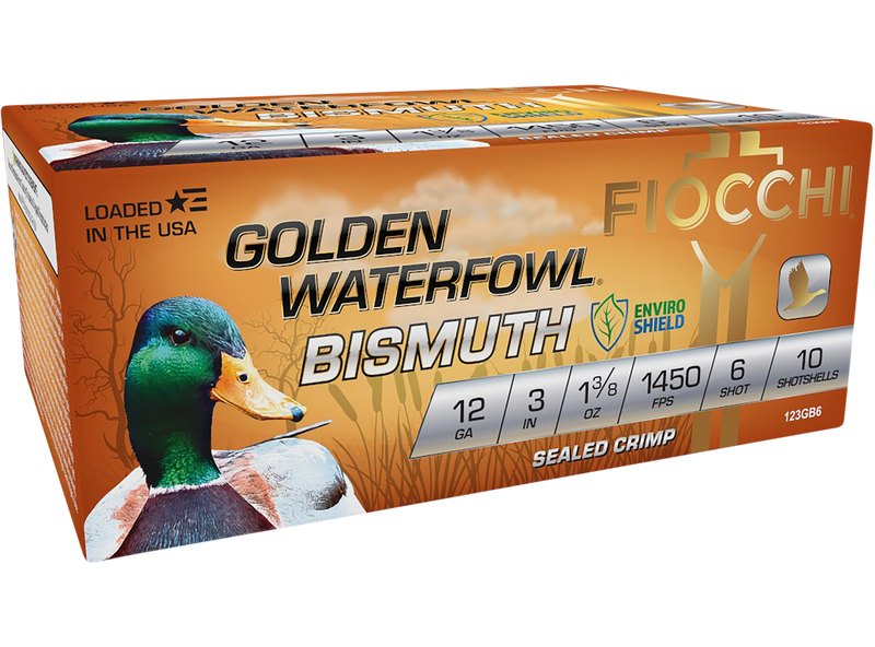 Fiocchi Golden Waterfowl Bismuth shotshells are loaded with high-density bismuth shot for non-toxic waterfowl hunting. These 12 gauge 3" shells deliver 1 3/8 oz of #6 shot at 1450 fps, providing dense patterns and extended range for effective wing shooting in the duck blind.