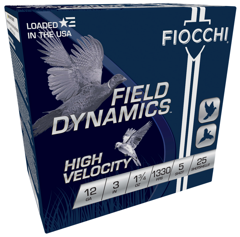 Fiocchi Field Dynamics High-Velocity shotshells in 12 gauge 3" magnum with 1 3/4 oz of #5 lead shot. These hunting loads deliver 1330 fps muzzle velocity and are designed for multiple hunting applications with a combination of specialty powders and quality components.