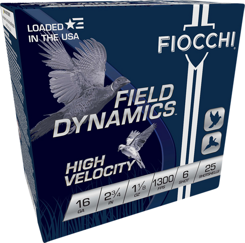 Fiocchi High Velocity 16 gauge shotshells with 1 1/8 oz of #7.5 lead shot in 2.75" plastic hulls, delivering 1300 fps muzzle velocity. Designed for hunting and target shooting applications, these Field Dynamics loads offer reliable performance and affordability. Each box contains 25 rounds.