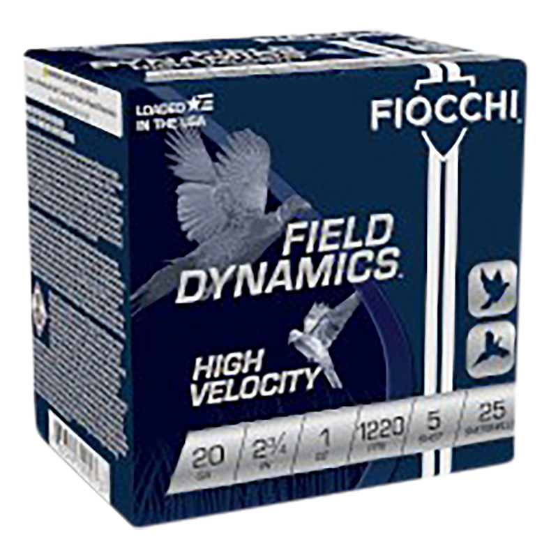 Fiocchi Field Dynamics High Velocity 20 gauge shotshells loaded with 1 oz of #5 lead shot in a 2.75" plastic hull. These hunting and target loads deliver 1220 fps muzzle velocity, making them suitable for upland game and clay shooting applications.