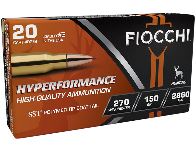 Fiocchi Hyperformance centerfire rifle ammunition in .270 Winchester with 150-grain Super Shock Tip projectiles, delivering 2860 fps muzzle velocity and 2724 ft-lbs of energy. Designed for hunting applications, the tipped bullet design provides consistent expansion and superior weight retention for reliable performance on game. Packaged 20 rounds per box with brass cases.