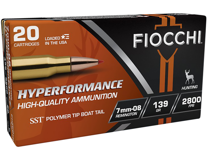 Fiocchi Hyperformance 7mm-08 Remington centerfire rifle ammunition loaded with 139-grain Super Shock Tip (SST) bullets. Delivers 2800 fps muzzle velocity and 2420 ft-lbs of muzzle energy with brass cases suitable for reloading. Designed for hunting applications with consistent expansion and superior weight retention.