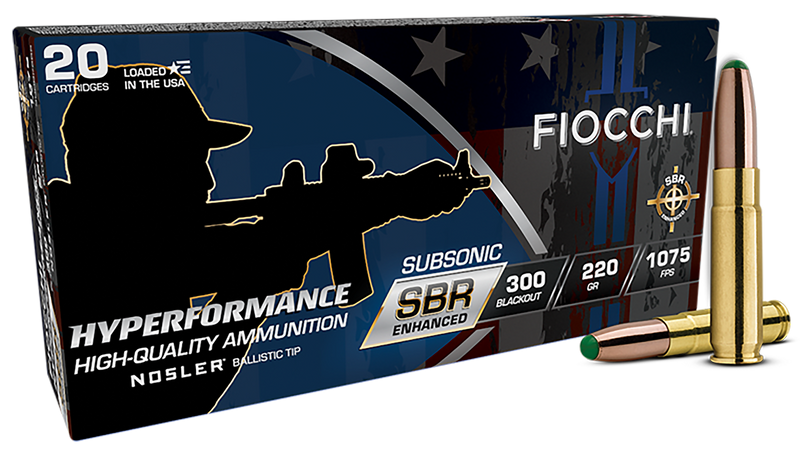 Fiocchi Hyperformance SBR ammunition in 300 Blackout with 220-grain Nosler Boat Tail projectiles, delivering 1075 fps muzzle velocity and 570 ft-lbs of energy. Precision-tuned for short-barrel rifles (11.5" to 7.5"), optimized for suppressors, and features low flash, complete powder burn, and reduced report. Brass cased, reloadable, boxer-primed ammunition manufactured in the USA.