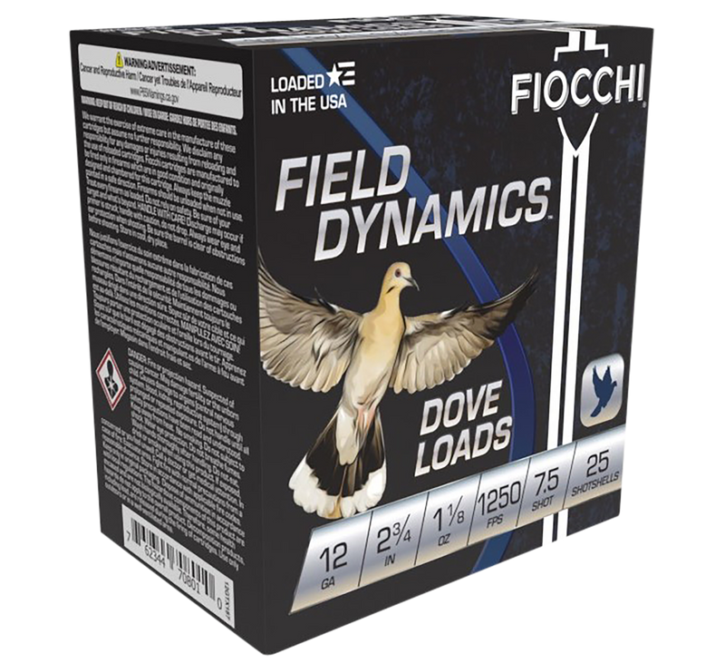 Fiocchi Field Dynamics 12 gauge shotshells loaded with 1 1/8 oz of #7.5 lead shot at 1250 fps. Designed specifically for dove and quail hunting with consistent patterns and reliable performance. Plastic casing.