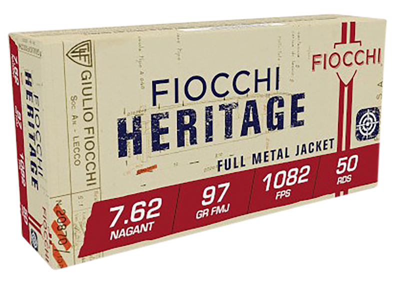 Fiocchi Heritage centerfire handgun ammunition in 7.62x38mmR Nagant caliber with 97-grain full metal jacket bullets. This ammunition delivers 1082 fps muzzle velocity and approximately 252 ft-lbs of energy, suitable for target shooting in Nagant revolvers. Packaged in 50-round boxes with brass casings and Boxer primers.