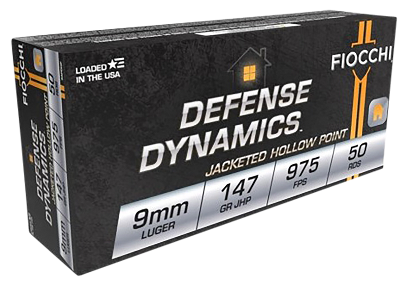 Fiocchi Defense Dynamics 9mm Luger ammunition loaded with 147-grain Jacketed Hollow Point bullets, delivering 975 fps muzzle velocity and 310 ft-lbs of energy. This brass-cased, boxer-primed ammunition is designed for personal protection and home defense applications. Packaged 50 rounds per box with 20 boxes per case.