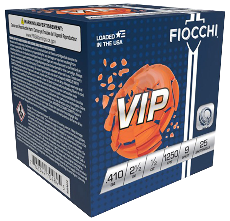 Fiocchi Exacta Target VIP shotshells are loaded in plastic cases with 1/2 oz of #9 lead shot for 410 gauge, 2.5" shells. These target loads deliver 1250 fps velocity and are suitable for sport shooting and small game hunting.