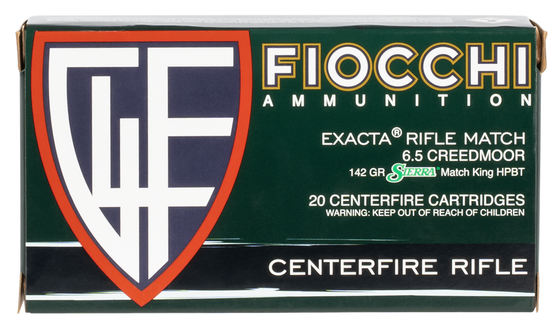 Fiocchi Hyperformance Compete 6.5 Creedmoor ammunition loaded with 142gr Sierra MatchKing BTHP bullets designed for precision target shooting. This factory-loaded match-grade ammunition delivers 2675 fps muzzle velocity and 2225 ft-lbs of energy from Fiocchi's Ozark, Missouri facility. Comes in boxes of 20 rounds with brass cases.
