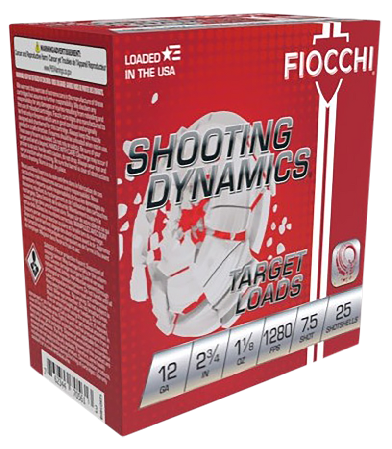 Fiocchi Shooting Dynamics target shotshells in 12 gauge with 2.75" plastic casings, 1 1/8 oz of #7.5 lead shot, and 1280 fps muzzle velocity. Designed for sport shooting and clay target sports. These 25-round boxes are ideal for range practice and competitive shooting.