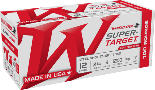 Fiocchi Steel Target shotshells in 12 gauge with 2.75" plastic casing, loaded with 1 1/8oz of #7 treated steel shot. These rounds deliver 1375 fps muzzle velocity and are designed as an environmentally friendly target load for range shooting where steel shot is required or preferred.