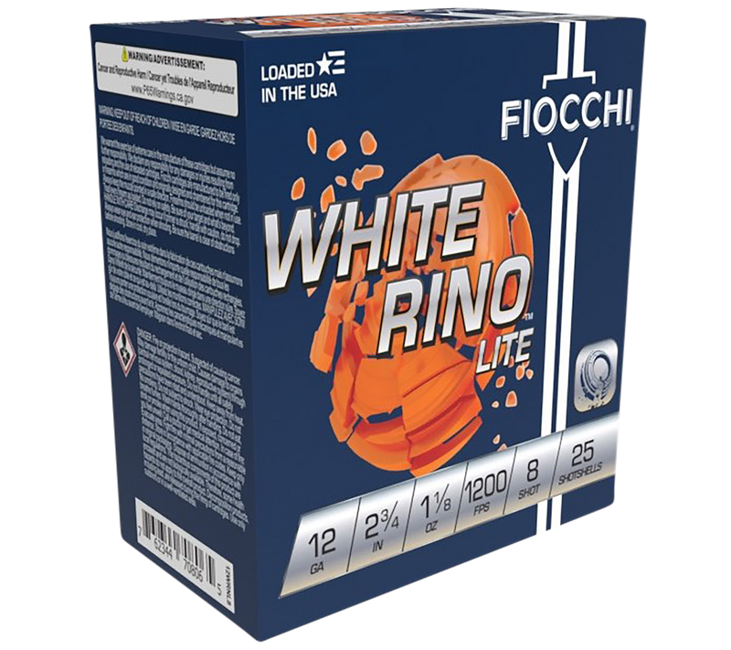 Fiocchi White Rino Lite shotshells in 12 gauge 2.75" with 1 1/8oz of #8 lead shot at 1200 fps. These target loads are designed for sport shooting and clay target sports, featuring clean progressive powders and cushioned wad systems that reduce recoil by approximately 30%. Plastic casing with 25 rounds per box.