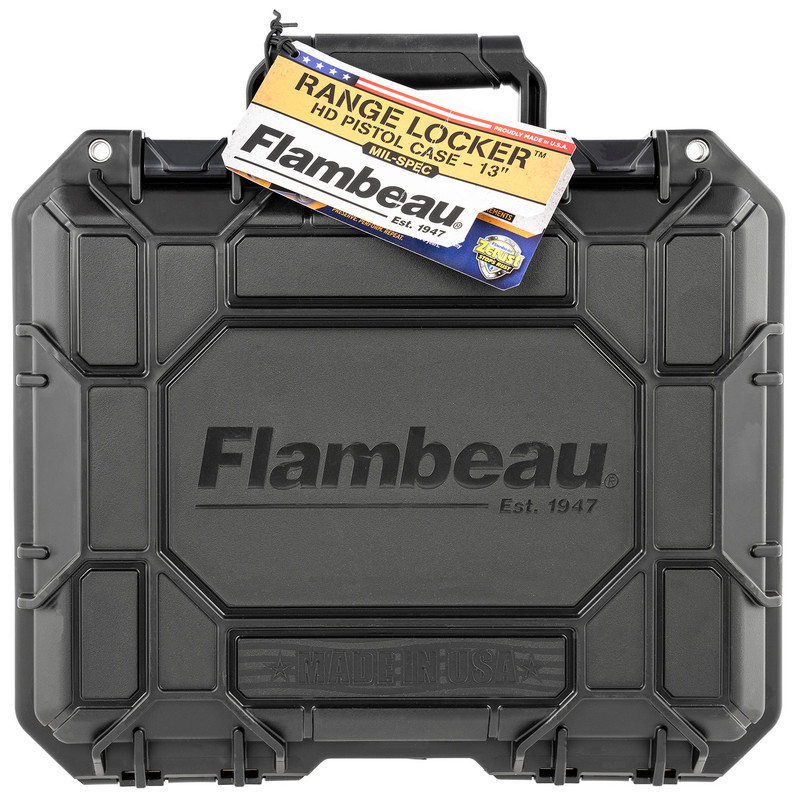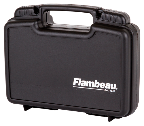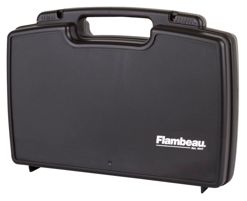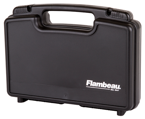 The Flambeau 1312SN is a black polymer pistol case designed to hold a full-size handgun or multiple compact handguns. It features foam padding, lockable security, and measures 16.5" L x 13.0" W x 5.3" H, making it suitable for range transport and storage.