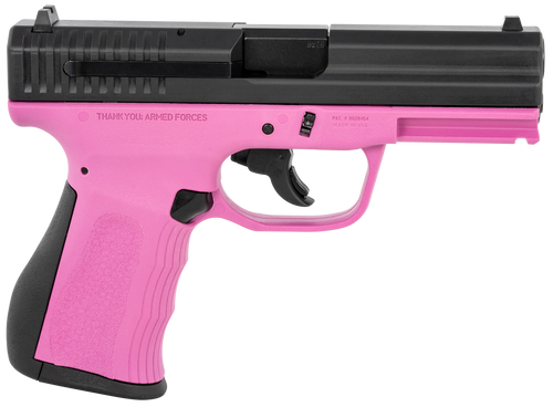 The FMK 9C1 G2 is a striker-fired semi-automatic pistol chambered in 9mm Luger with a 4" barrel and 14+1 round capacity. It features a serrated black carbon steel slide, dark gray polymer frame with Picatinny rail, and interchangeable backstraps for improved ergonomics and reduced felt recoil. This compact handgun weighs 23.45 oz and measures 9.8" overall length with 3-dot contrast sights.