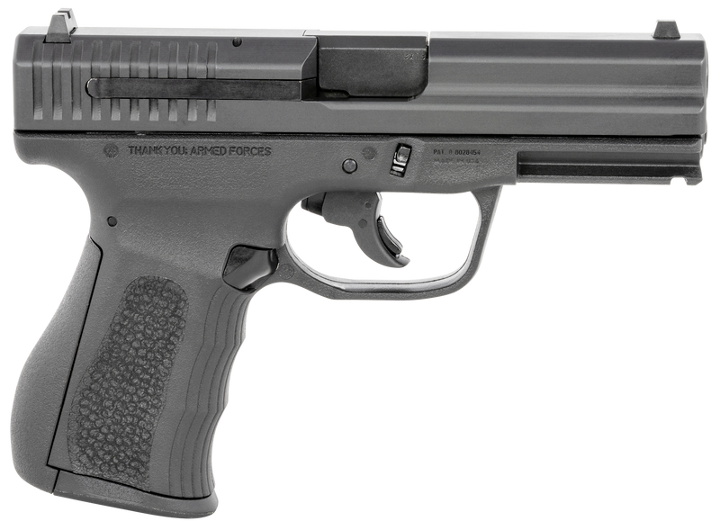 FMK 9C1 G2 is a double-action-only, semi-automatic polymer frame pistol chambered in 9mm Luger with a 4" barrel and 10+1 round capacity. Features include a black serrated carbon steel slide, black stainless steel barrel, Picatinny rail, fixed 3-dot sights, and trigger safety. CA/MA compliant configuration with matte black finish.