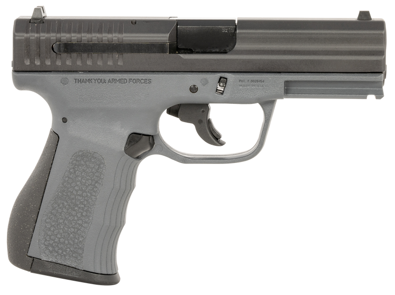 FMK 9C1 G2 is a 9mm Luger semi-automatic pistol with a 3.87" barrel and double-action-only (DAO) trigger. This CA/MA compliant model features a 10-round capacity, serrated slide, and black backstrap grips. Dimensions are 9.8" length x 6.4" width x 2.5" height.