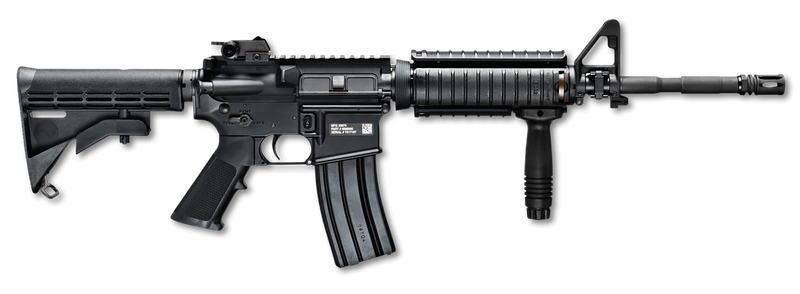 Semi-automatic rifle chambered in 5.56 NATO with a 16-inch chrome-lined, button-broached barrel featuring a 1:7 twist rate. Features an ambidextrous safety and selector, 6-position collapsible stock, A2 front sight and adjustable rear sight, permanently pinned A2 compensator, and Knights Armament M4 rail system. Weighs 6.6 lbs with overall length of 30.5" to 34.2" depending on stock position.