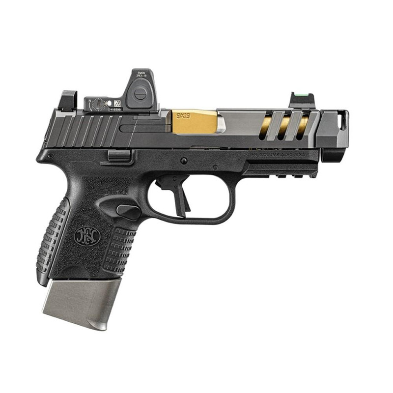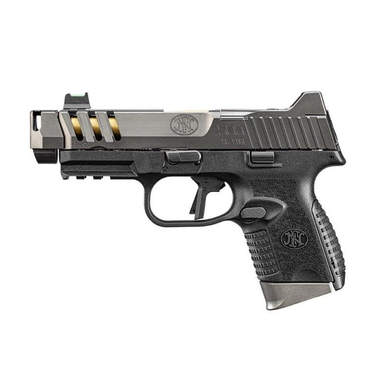 The FN 509 CC Edge is a striker-fired 9mm semi-auto pistol with a 4.2" threaded barrel and 15+1 capacity. It features an integrated FN compensator that reduces muzzle flip by 25%, a low-profile optics mounting system for red dot installation, and suppressor-height fiber optic sights. The pistol includes a polymer frame, flat-face trigger, and comes with three magazines (one 12rd, two 15rd).