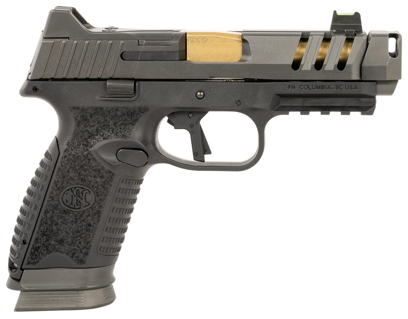 The FN 509 CC Edge XL is a striker-fired semi-automatic pistol chambered in 9mm Luger with a 4.2" cold hammer-forged barrel and quick-detach compensator designed to reduce muzzle rise up to 25%. This compact pistol features a full-sized frame with improved texturing, fiber optic sights, optics mounting system, and comes with three 17-round magazines, weighing 29 oz with an overall length of 7.5".