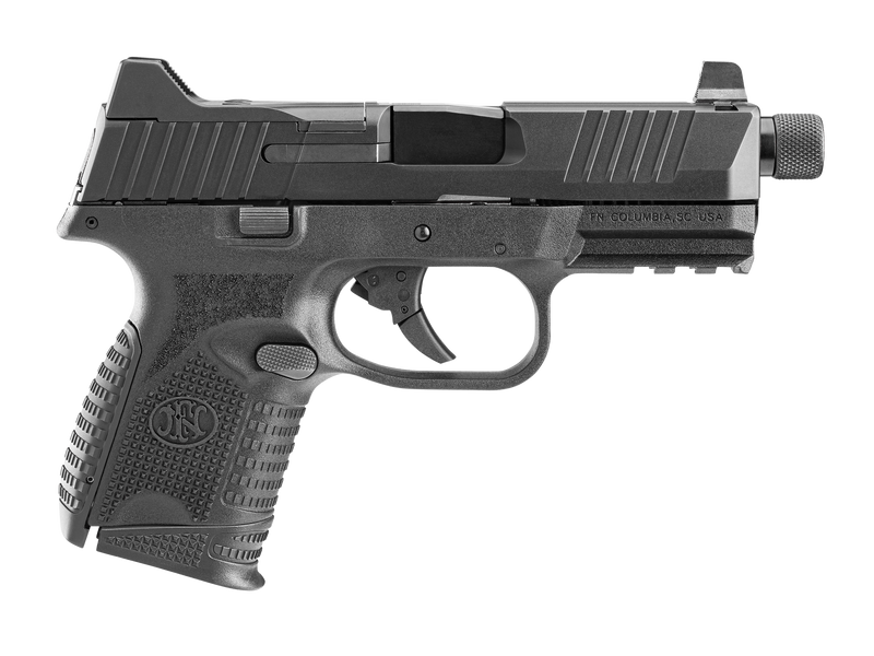 Striker-fired 9mm compact tactical pistol with 4.32" cold hammer-forged threaded barrel and optic-cut PVD slide. Features black polymer frame with Picatinny rail, suppressor-height night sights, and FN Low Profile Optics Mounting System. Includes one 12-round and one 24-round magazine; weighs 26.2 oz.