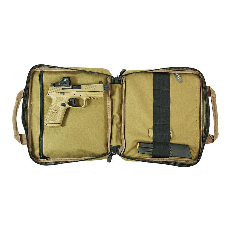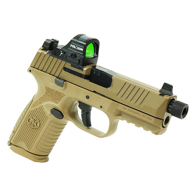 Semi-automatic 9mm pistol with 4.5" cold hammer forged stainless steel barrel and threaded muzzle (1/2x28 TPI) for suppressor compatibility. Features FN Low Profile Optics Mounting System with included Holosun 407C red dot sight, suppressor-height 3-dot iron sights, and ships with one 15-round and one 24-round magazine. Frame and slide finished in Flat Dark Earth with enhanced grip texturing and interchangeable backstraps.