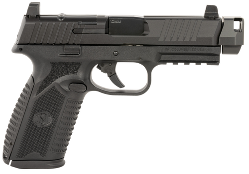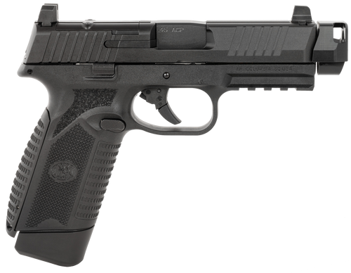 Striker-fired semiautomatic pistol chambered in .45 ACP with a 4.43-inch cold hammer-forged stainless-steel barrel and patented FN Low-Profile Optics-Mounting System for direct optic mounting. Features an auto-indexing FN compensator that reduces muzzle flip-up to approximately 35%, serrated optic-ready slide, and includes two 10-round magazines.