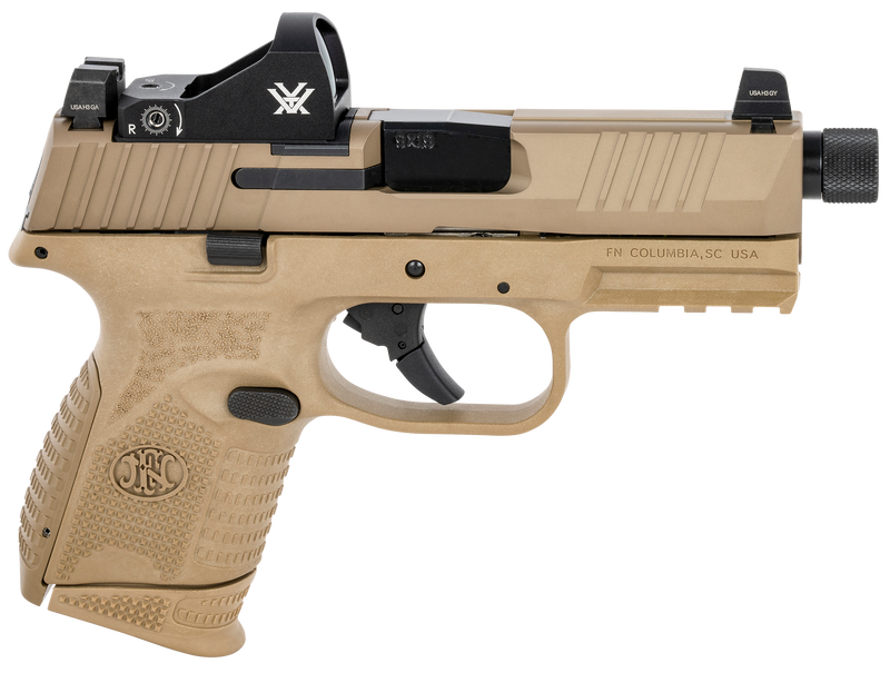 The FN 509 Compact Tactical is a 9mm Luger striker-fired pistol with a 4.32" threaded barrel and optic-cut slide ready for red dot mounting. It features a 12+1 round capacity, FDE polymer frame with interchangeable backstraps, mounting rail, and includes a Viper red dot sight with 3-dot night sights.