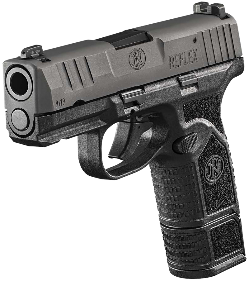 The FN Reflex is a single-action, internal hammer-fired 9mm semi-automatic pistol with a 3.3" cold hammer-forged barrel and 10+1 capacity. Features a polymer micro-compact frame with manual safety, tritium night sights, stippled grip, and Picatinny rail for optics mounting. Weighs 18.4-18.5 oz with an overall length of 6.2" and width of 8.3", designed for everyday carry and deep concealment.