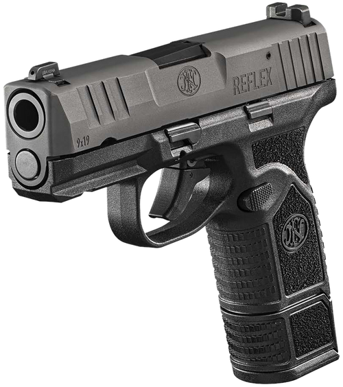 The FN Reflex is a single-action-only, semi-automatic 9mm pistol with a 3.3" cold hammer-forged barrel and internal hammer design optimized for everyday carry and concealment. It features a polymer micro-compact frame with stippled grips, manual safety, tritium night sights, and comes with two magazines (one 15-round and one 11-round). The pistol weighs 18.5 oz and measures 6.2" overall length with a slim profile and Picatinny rail for accessories.
