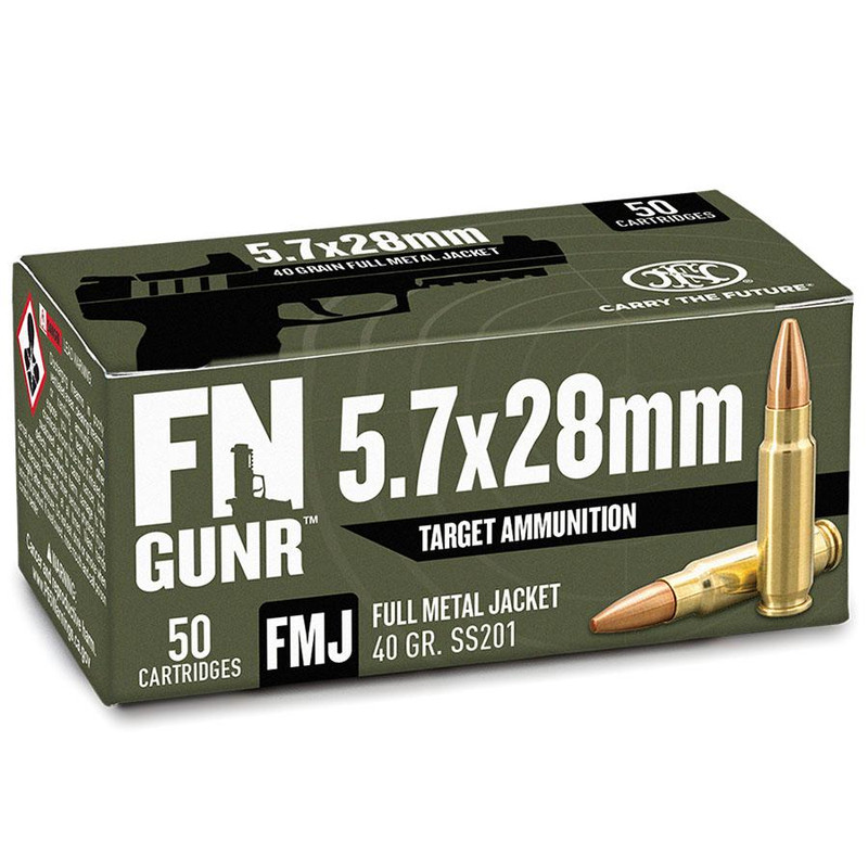 FN SS201 5.7x28mm ammunition loaded with 40-grain FMJ bullets delivering 2040 fps muzzle velocity and 370 ft-lbs of energy. This brass-cased, boxer-primed ammunition is ideal for training, target shooting, and tactical applications with consistent accuracy and reliable performance across 500 rounds per case.