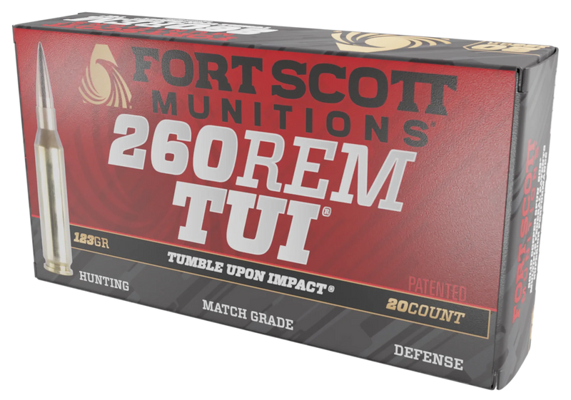 Fort Scott Munitions 260 Rem centerfire rifle ammunition loaded with 123-grain solid copper spun bullets designed for defense and hunting applications. Features a muzzle velocity of 2782 fps with brass casing. Packaged 20 rounds per box, 25 boxes per case.