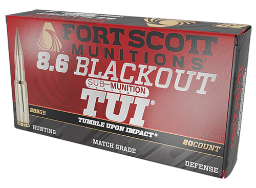 Fort Scott Munitions 300 Blackout 190gr Tumble Upon Impact (TUI) solid copper spun rifle ammunition designed for home defense applications. This centerfire rifle round delivers 960 fps muzzle velocity and 235 ft-lbs of energy, packaged 20 rounds per box with 25 boxes per case.