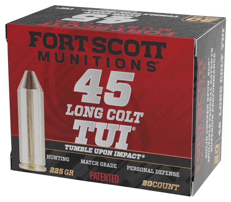 Fort Scott Munitions 45 Long Colt ammunition loaded with 225-grain Solid Copper Spun bullets featuring Tumble Upon Impact (TUI) technology for self-defense and hunting applications. The rounds feature nickel-plated casings and achieve a muzzle velocity of 869 fps. Sold in boxes of 20 rounds with 25 boxes per case.
