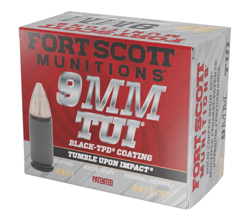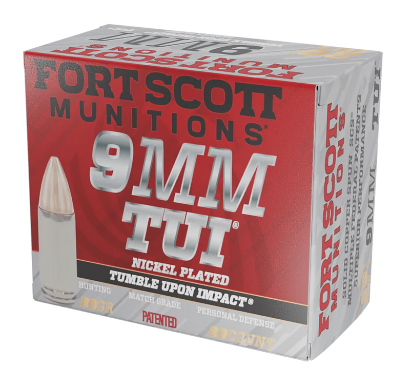 Fort Scott Munitions 9mm Luger 80-grain solid copper spun ammunition with Tumble Upon Impact (TUI) technology for self-defense and home defense applications. Nickel-plated brass casing with 1356 fps muzzle velocity and 326 ft-lbs muzzle energy. Sold in 20-round boxes, 25 boxes per case.