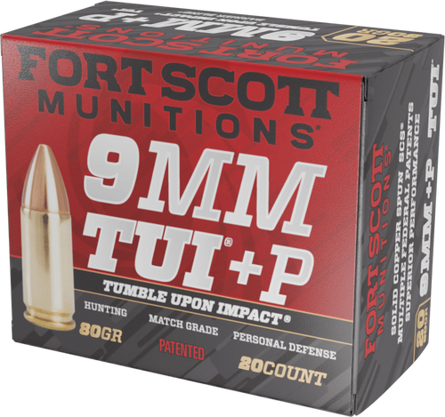 Fort Scott Munitions 9mm Luger centerfire handgun ammunition loaded with 80-grain solid copper spun bullets. Features Tumble Upon Impact (TUI) technology and TPD-9 coating on nickel-plated brass cases, designed for self-defense and home defense applications with 1356 fps muzzle velocity and 326 ft-lbs energy. Sold in 20-round boxes, 25 boxes per case.