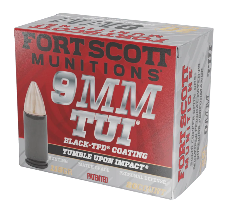 Fort Scott Munitions Tumble Upon Impact (TUI) 9mm Luger ammunition loaded with 115 grain solid copper spun bullets. Features nickel-plated brass cases with TPD-9 coating, producing 1140 fps muzzle velocity and 230 ft-lbs of muzzle energy. Designed for self-defense and home defense applications with 20 rounds per box.