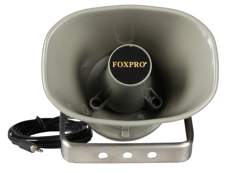 The Foxpro SP60 is an external speaker designed to amplify sound output from Foxpro game calls equipped with 3.5mm external speaker jacks. It includes an 8-foot speaker cable and mounting bracket for flexible placement in the field. This gray speaker enhances audio projection for more effective game calling.