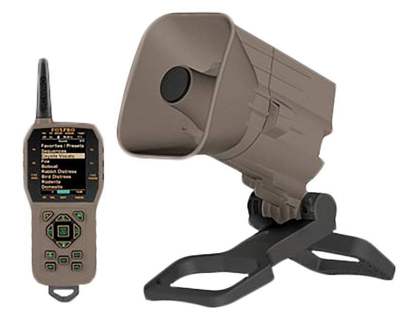 The Foxpro X24 is an electronic game call featuring 100 preloaded sounds to attract multiple game species. This tan ABS polymer unit measures 11.7" x 10.7" x 8.0" and operates on a Li-ion battery. It is designed for hunters seeking a portable, digital solution for game calling.