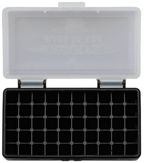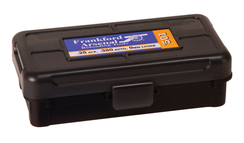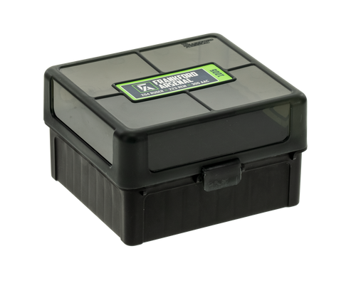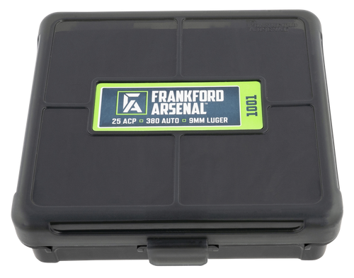 Frankford Arsenal hinge-top ammo box designed to safely store and organize ammunition for 9mm, 380 ACP, and 25 ACP cartridges. This polymer construction box holds up to 50 rounds and features a secure hinge-top closure for reliable storage at the range or in the field.