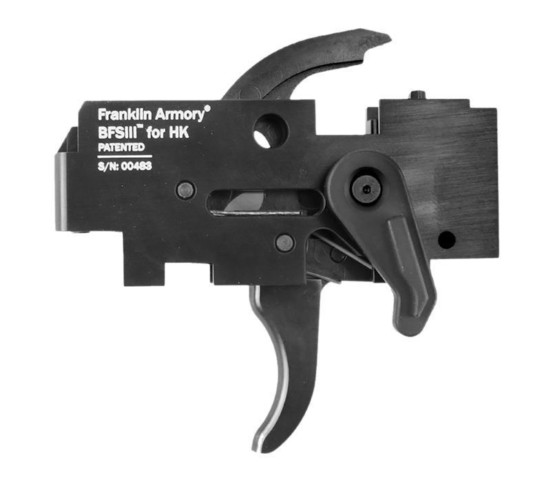 The Franklin Armory BFSIII HK-C1 is a 3-position binary firing trigger designed for HK 91/93/94 platform rifles. It features a curved trigger design with a 4.5 lb trigger pull, ambidextrous safety selector, and steel construction. The binary mode fires one round on trigger pull and one round on release, enabling faster semi-automatic fire with reduced split times for tactical and competition applications.