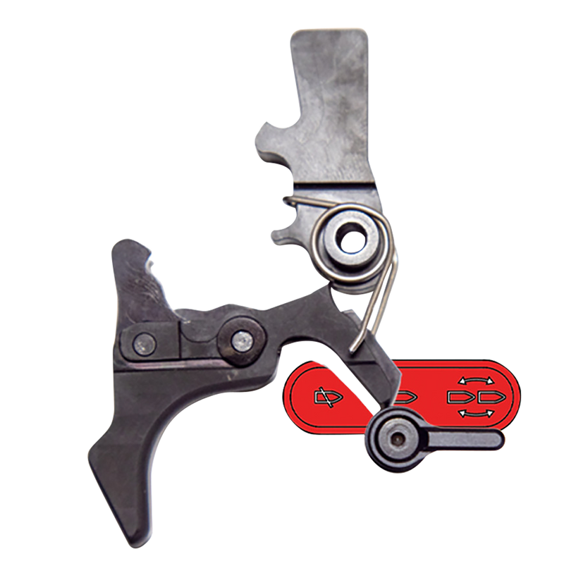 The BFSIII is a 3-position binary trigger designed for Ruger PC Carbine and PC Charger pistol caliber carbines. The curved trigger features a 4.5 lb pull and fires one round on trigger pull and one round on release in position 3, with safe and semi-automatic positions available. Constructed from steel with a black finish, this single-stage trigger installs directly into compatible Ruger platforms.