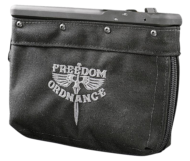 The Freedom Ordnance FM-9 is a black waist-mounted belt bag designed to hold up to 100 rounds of 9mm ammunition during range sessions. This accessory features a waist mount configuration for convenient carry and quick access to ammunition while shooting.