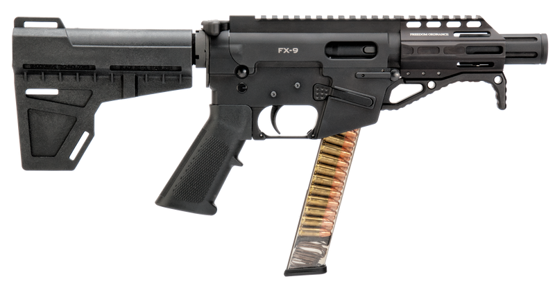 The Freedom Ordnance FX-9 is a semi-automatic AR-style pistol chambered in 9mm Luger with a 4.5" black nitride chromoly steel barrel and 31+1 round capacity. Features include an optic-ready upper, M-LOK handguard, threaded barrel, and KAK Shockwave pistol brace. Built from precision machined billet aluminum with black hard coat anodized finish, it weighs 4.5 lbs and measures 25.8" overall length.