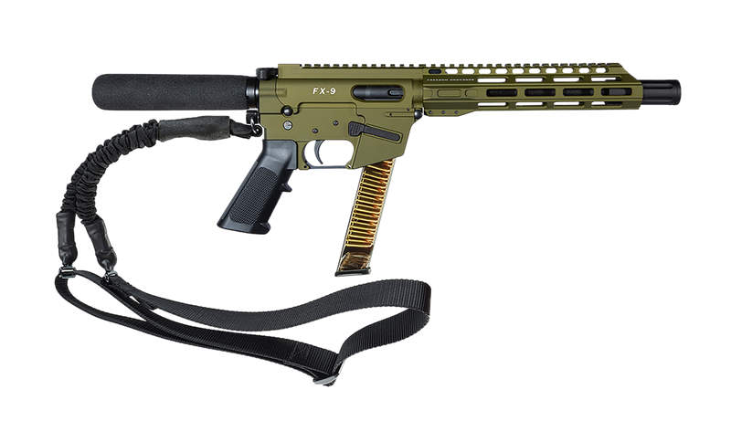 The FX9P is a 9mm Luger semi-auto pistol with a 10" black nitride stainless steel barrel and 31+1 round capacity. Features an AR15 grip, M-LOK handguard, black anodized aluminum Picatinny rail receiver, and OD green polymer pistol tube. Weighs 5.91 lbs with an overall length of 24.62".