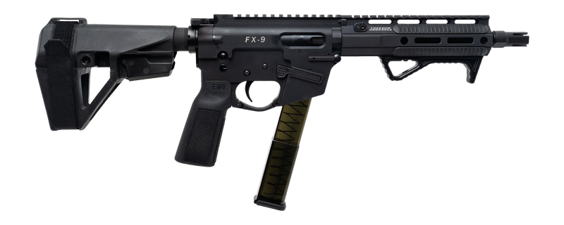 Semi-automatic 9mm pistol with 8" barrel and 32-round capacity. Features SBA5 pistol brace, flash suppressor, anodized black finish, BCM B5 grip and trigger guard, Warhammer ambidextrous charging handle, and Freedom Ordnance angled fore grip.