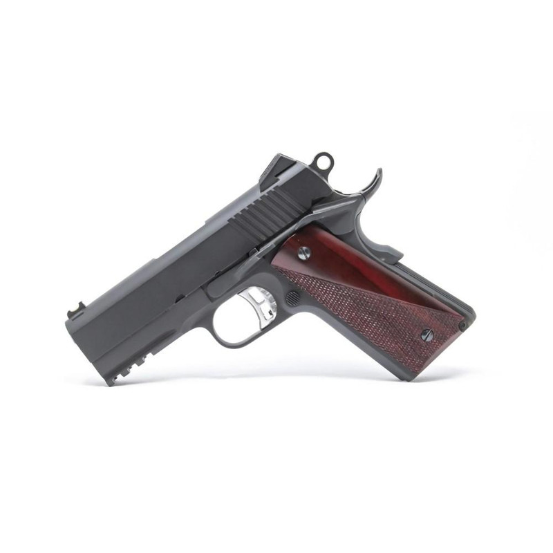 Semi-auto 1911 tactical hybrid chambered in 45 ACP with a 3.5" barrel and 8-round capacity. Features a commander frame with officer's slide design for compact carry, CNC machined from bar-stock construction with fixed sights and black finish with wood grips.