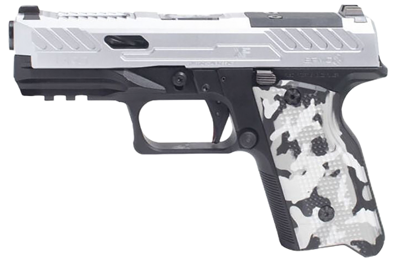 Semi-automatic striker-fired 9mm compact pistol with 4" fluted barrel and 10-round capacity. Features aluminum frame with tactical rail, fixed combat sights that are optic-ready (RMR/RMS compatible), Tenifer finish, and includes two interchangeable aluminum grips (Snow Camo and Black) and two Glock-compatible magazines. Weighs 26.5 oz with overall length of 7.29 inches.